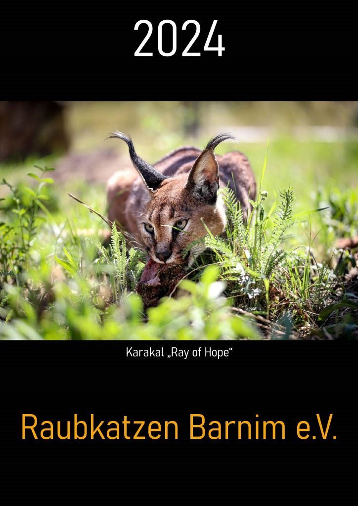 Der neue Fotokalender 2024 von den tierischen Bewohnern des Felidae Wildkatzen- und Artenschutzzentrums Barnim ist endlich im Verkauf! Der Kalender ist im Format DinA4 mit Ringbindung und Halte-Öse. Zwölf wunderschöne Motive zieren die Monatsblätter. Karakalmännchen Ray of Hope hat das Rennen zum zusätzliche Covermotiv gemacht. Wie immer sind Diego, Heike, Coco, Batani & co. zu bestaunen. Aber auch einige unbekannte Gesichter, wie Feuerwiesel Nudel oder Rotluchs Bonny sind zu bestaunen. Die Aufnahmen entsprangen der Linse unserer Zoo-Fotografen Rico Peick und Fabian Fischer. Zu erwerben ist der Kalender vor Ort im Zoo-Shop des Zentrums oder in unserer Tierarztpraxis Rafael in Zepernick (Alt Zepernick 22, 16341 Panketal OT Zepernick) für 12,50 € oder per E-Mail an info@raubkatzen-barnim.de für 15 €. Der Erlös des Kalenderverkaufs geht wie immer an die verschiedenen Projekte unseres Unterstützervereins, dem Raubkatzen Barnim e.V.